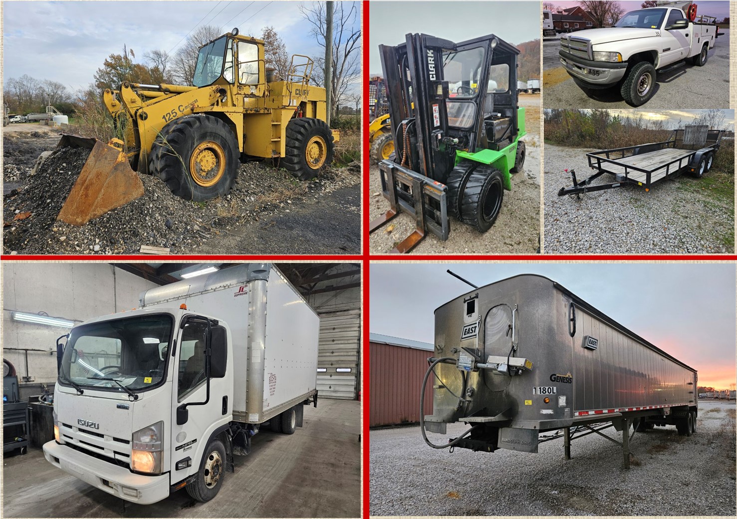 Online Only Auction will begin closing December 18, 2025 at 10:00am CST. Trucking equipment surplus liquidation auction. Selling trucks, service trucks, pickups, payloaders, grater, tractors, dry vans, dry bulk tank trailers, tanker trailers, dump trailers, forklifts, skidsteers, and man lift. Preview Dates for INDIANA locations: December 15, 16, and 17, 2025, from 9:00am-4:00pm. Bring your […]